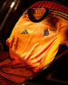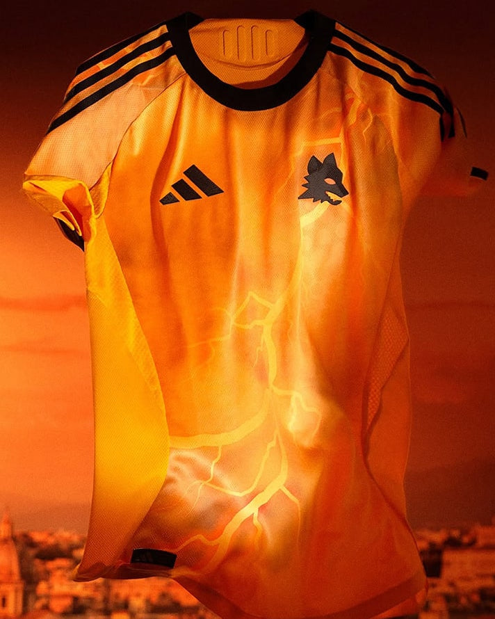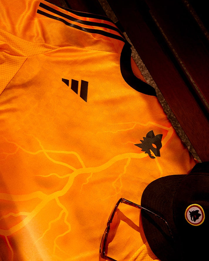 Engineered for the pitch. The 2025/26 Roma away kit stuns in a bold orange base with a dramatic lightning bolt graphic symbolizing Mars, the god of war, thunder, and the fierce origins of Rome. Black three-stripes, logo, and cuffs sharpen the look with contrast.