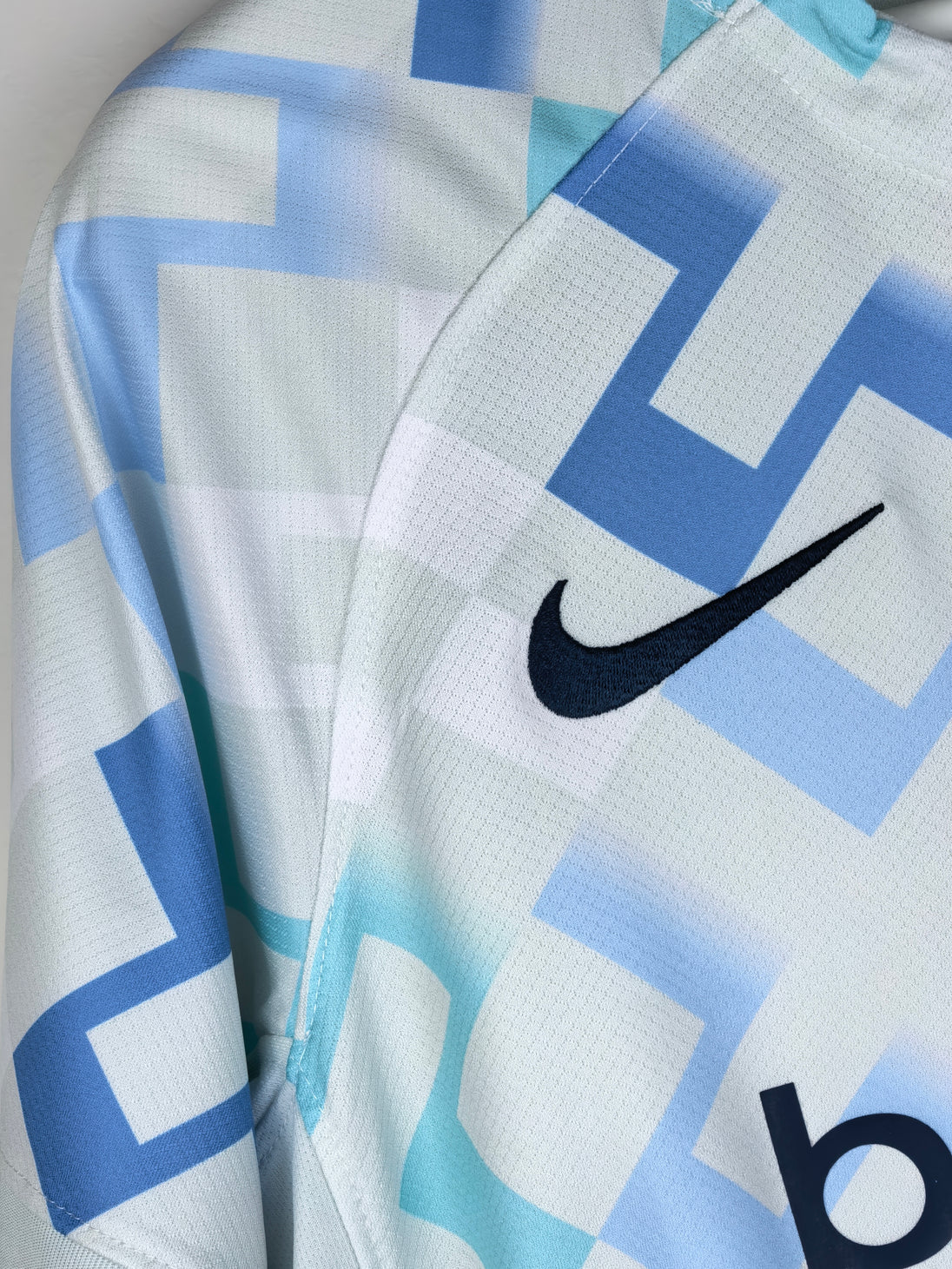 Cool, community-driven, and visually striking — this fan edition jersey is dressed in icy Ghost Aqua, overlaid with an interlocking pattern of blue and turquoise shapes inspired by Italian textile craft and the 2026 Winter Olympics hosted in Milan. The dark navy Nike swoosh, club crest, and Betsson sponsor contrast crisply against the soft base, tying together a design that's both modern and meaningful.