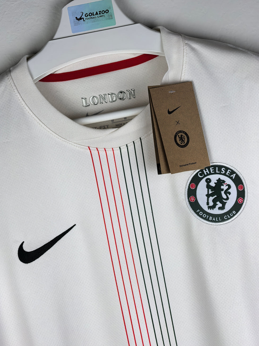 Clean, timeless, and iconic — this off-white stadium edition away shirt revives Chelsea’s famed 1974 “Magnificent Magyars” tribute with subtle green and red pinstripe detailing, nodding to one of the club’s most revered cult kits. The collar’s warm phantom base is delicately trimmed in Speed Red and Galactic Jade, giving it a refined vintage feel balanced by modern performance design.