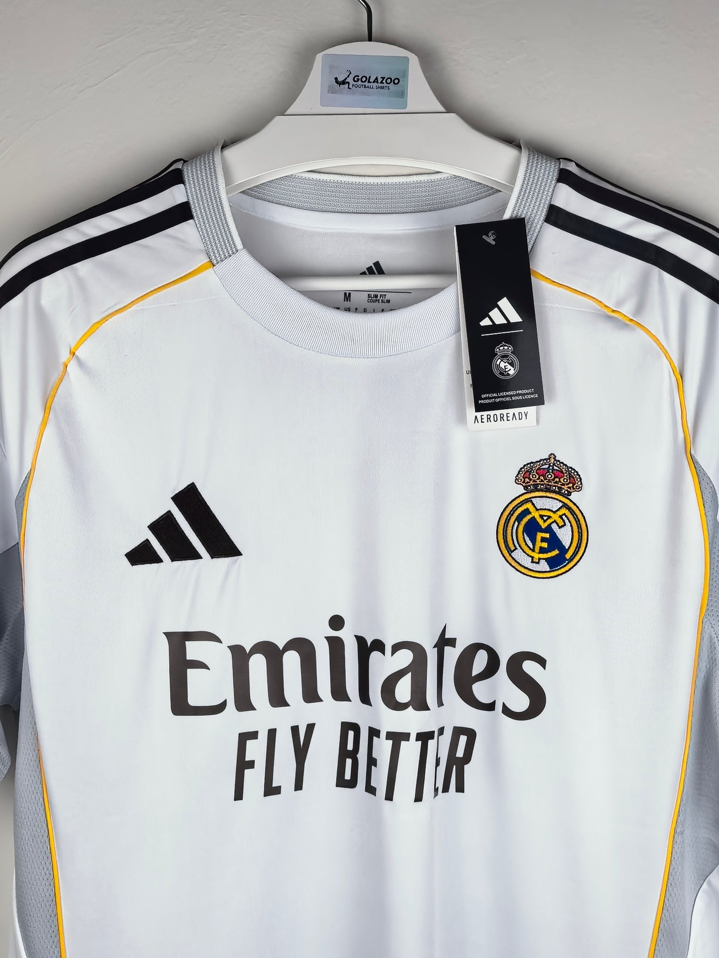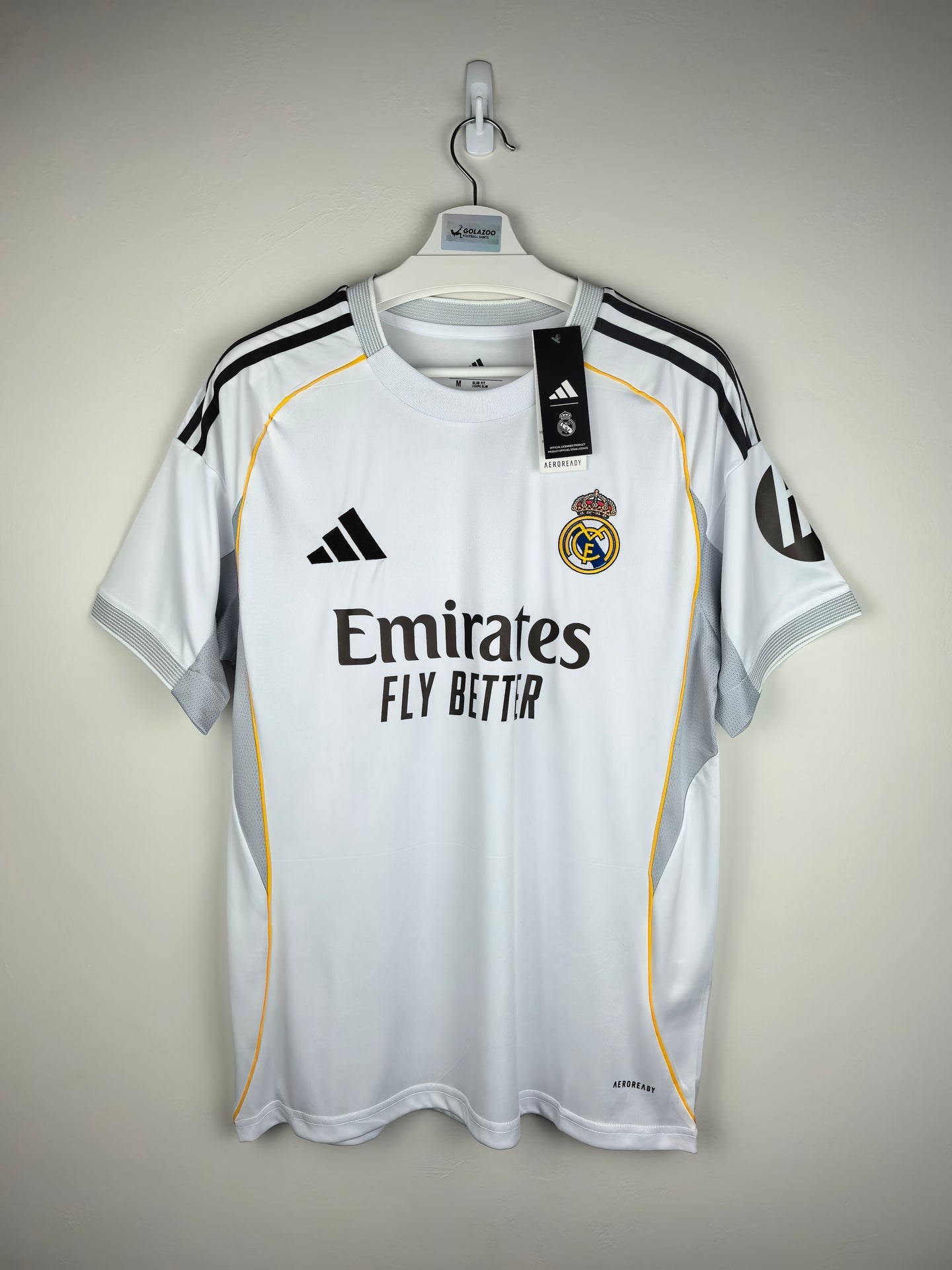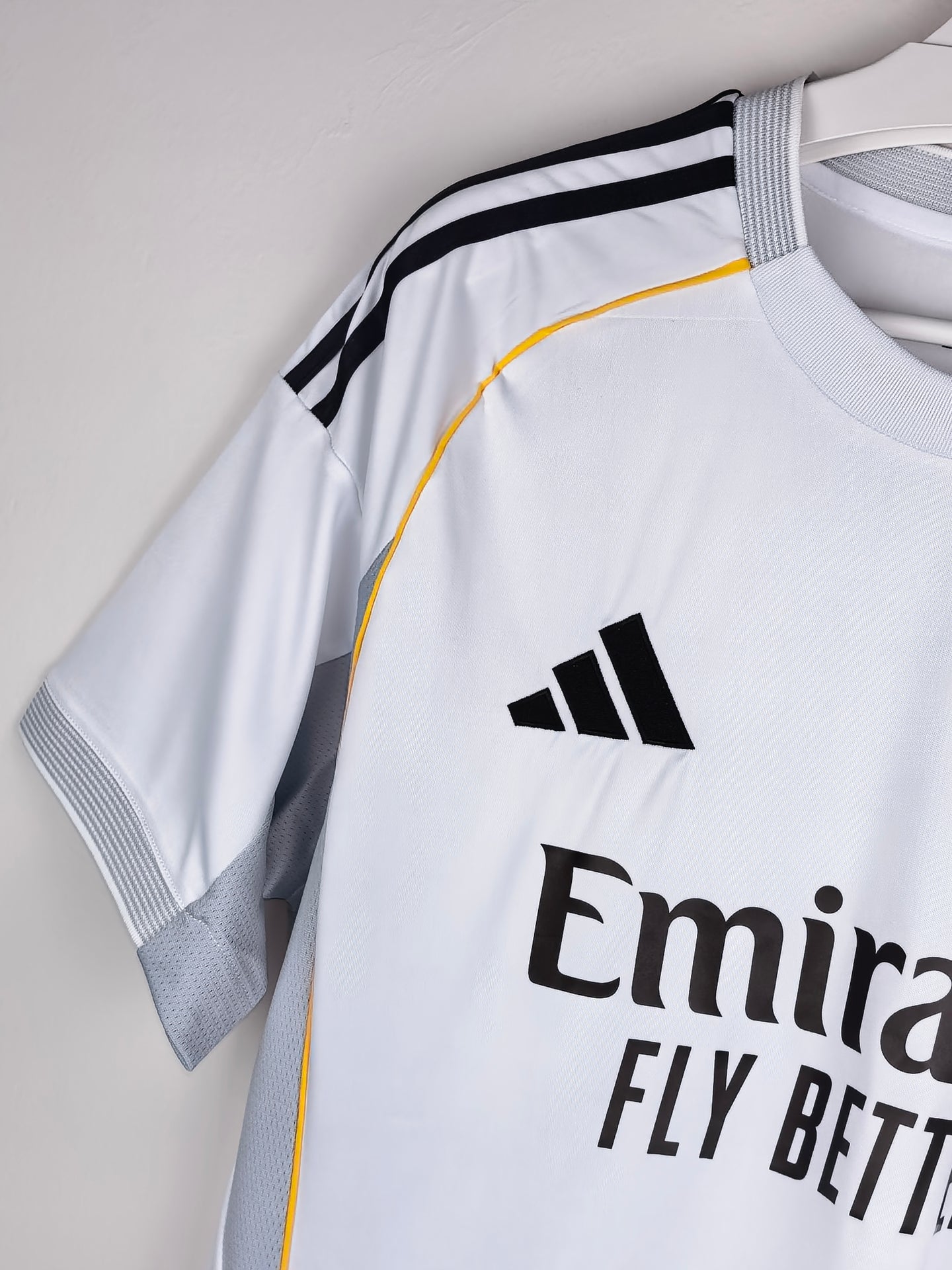 Pure elegance in classic white, trimmed with yellow piping inspired by the club crest and subtle grey textures echoing the Santiago Bernabéu’s facade. Crafted with lightweight recycled fabric and AEROREADY moisture-wicking tech, it’s designed to keep fans cool on and off the pitch. A sleek nod to tradition with just a fresh modern edge.