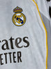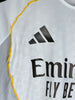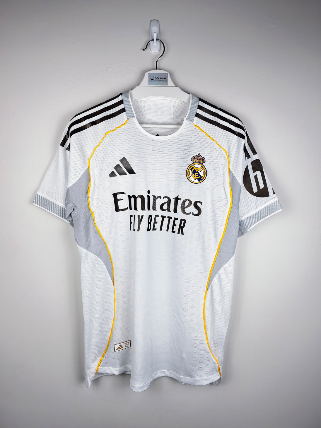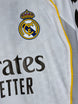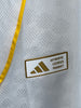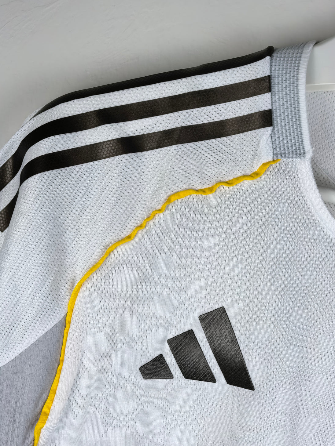 Clean white with sleek yellow piping and subtle grey tones—this isn’t just any replica. It’s the slim-fit player version, built for performance with recycled fabric, moisture-wicking AEROREADY, and heat-pressed crests for that elite matchday feel. Inspired by the refreshed Bernabéu, the tonal textures echo the stadium's facade. A compact, performance-driven homage to Real’s timeless tradition.