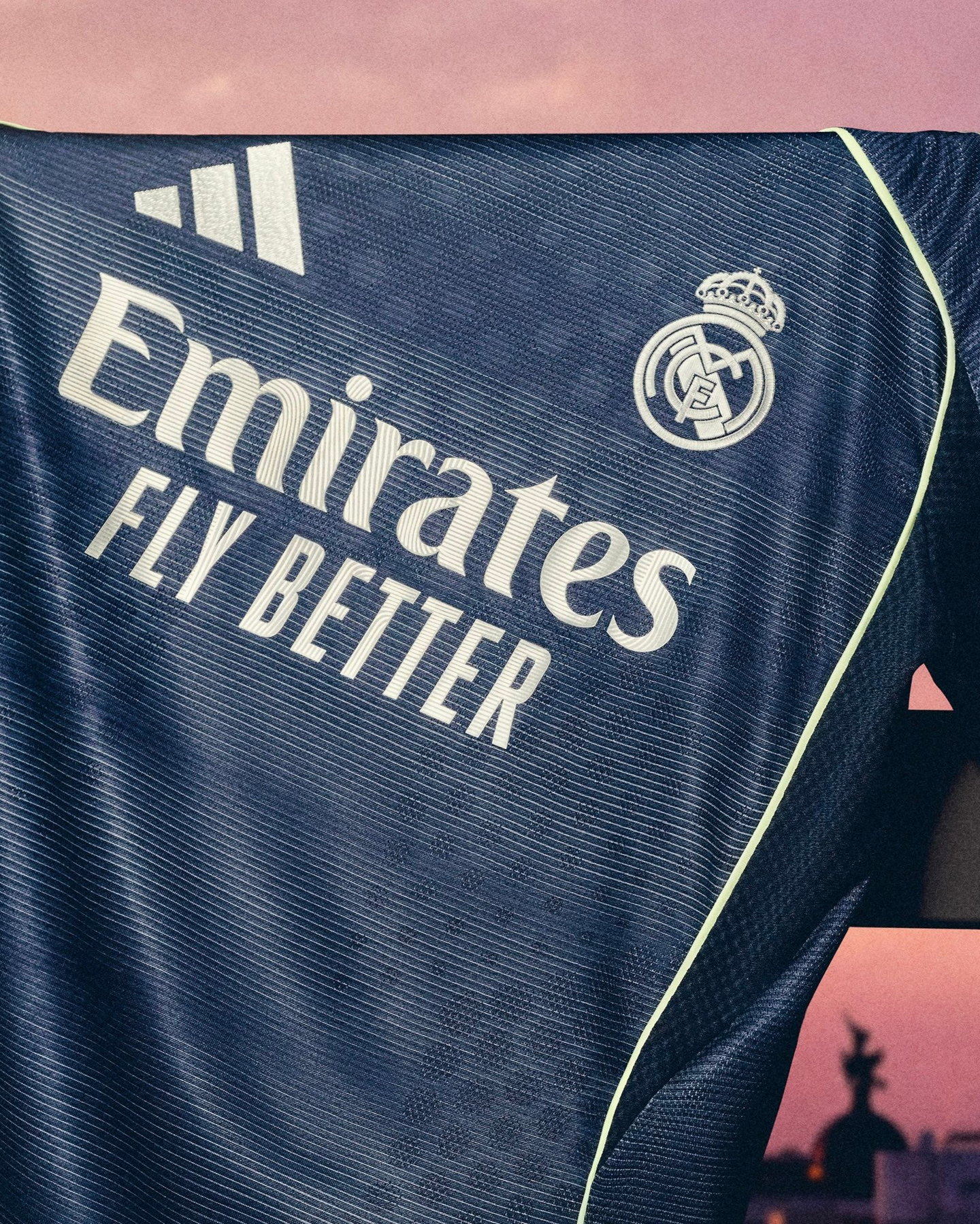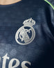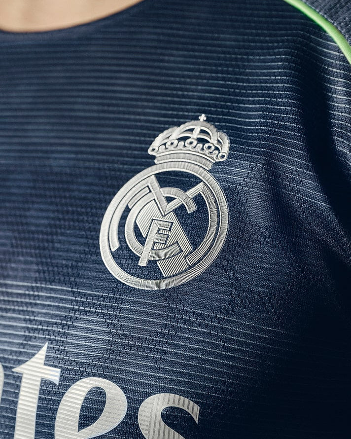 Naval-inspired navy jersey echoing the dusk skies of the Bernabéu, stylized with subtle façade-like stripe detailing and silver branding mirroring the stadium’s sleek metal exterior. Designed as the slim-fit Player Issue, it features adidas’ Teamgeist collar, AEROREADY moisture-wicking tech, mesh underarms, and heat-pressed crest—purely what the pros wear on the pitch.